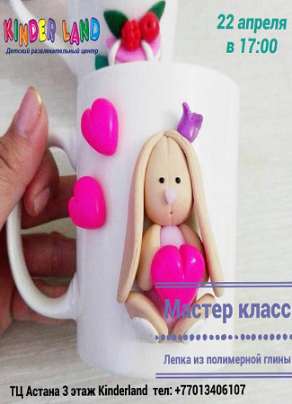 "Kinder Land" приглашает принять участие детей старше 6 лет в мастер-классе по лепке из полимерной глины кружечки "Зайка".