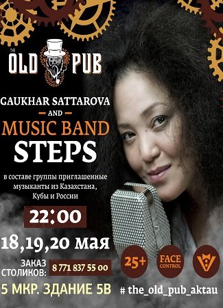 Бар "The Old Pub" приглашает всех жителей и гостей города Актау провести вечер с неповторимой Гаухар Саттаровой и Music Band "STEPS", в составе которой приглашенные музыканты из Казахстана, Кубы и России.