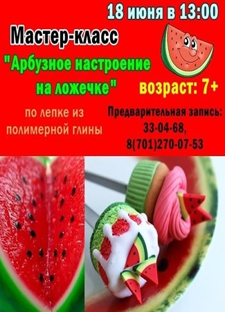 В детском развивающем центре "Апельсинка" состоится мастер-класс "Арбузное настроение на ложечке" по лепке из полимерной глины.