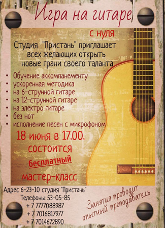 Студия "Пристань" приглашает всех на бесплатный мастер-класс по аккомпанементу. На нем вы сможете лично пообщаться с преподавателем, ознакомиться с методикой преподавания, задать интересующие вас вопросы, а также записаться в группу на занятия.