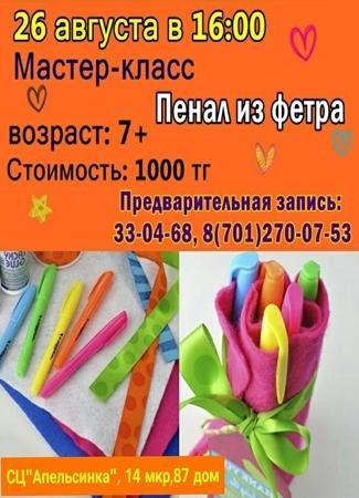 Маленьких жителей Актау приглашают на полезный и увлекательный мастер-класс по изготовлению пенала из фетра.