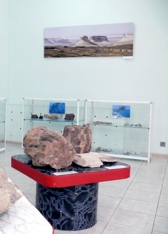 На выставке показаны образцы нуммулитового известняка представляющего собой сцементированные скопления раковин фораминифер. А также показаны окаменелые губки, кораллы, мшанки, раковины брахиопод или плеченогих, раковины двустворчатых, брюхоногих и головоногих моллюсков .