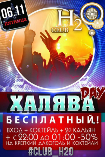 Уже в эту пятницу в ночном клубе Н2О - ХАЛЯВА! Бесплатный ВХОД! Коктейль в ПОДАРОК! СКИДКА -50% на крепкий алкоголь и коктейли до 01:00! 2й кальян в ПОДАРОК!!! ОТДЫХАЙ В КЛУБЕ Н2О!!! ОТРЫВАЙСЯ НА ПОЛНУЮ!!