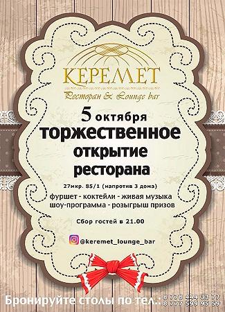Жителей Актау приглашают на торжественное открытие ресторана "Керемет". Гостей ожидают фуршет, коктейли, живая музыка, шоу-программа, розыгрыш призов.