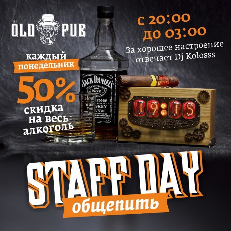 Каждый понедельник "The Old Pub" ждет тебя на Staff Day "Общепить". Только в этот день для тебя 50% скидка на весь ассортимент алкоголя! А за хорошее настроение и музыку отвечает Dj Kolosss!