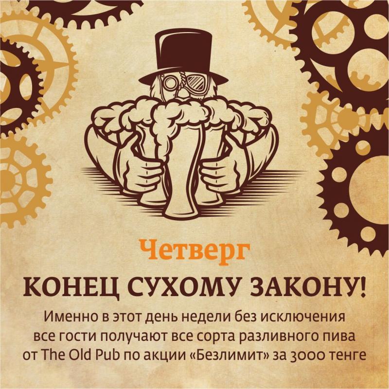 Именно в этот день недели все гости без исключения получают все сорта пива от "The Old Pub" по акции "Безлимит" за 3000 тенге!