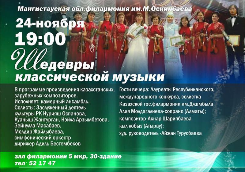 Жителей и гостей Актау приглашают на концерт камерного ансамбля. В программе ожидается исполнение произведений казахстанских и зарубежных композиторов.