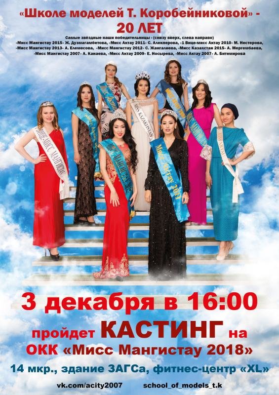 В фитнерс-центре "XL" пройдет отбор девушек от 16 до 24 лет и ростом не ниже 170 см для участия в областном конкурсе красоты "Мисс Мангистау 2018".