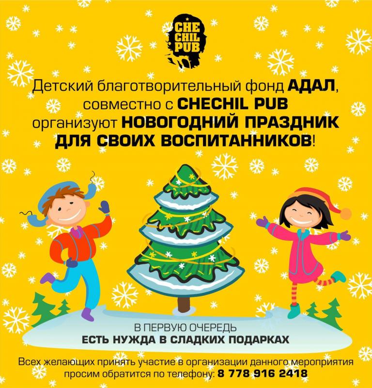 Детский благотворительный фонд "Адал" совместно с Chechil Pub планируют организовать новогодний праздник для детей и вы можете стать его частью, оказав помощь в организации и сладких подарках.