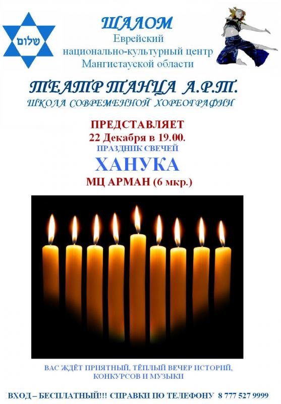 Еврейский найионально-культурный центр Мангистауской области и театр танца "А.Р.Т." приглашает жителей и гостей Актау приглашают на праздник свечей Ханука. Вас ждет приятный вечер историй, конкурсов и музыки.