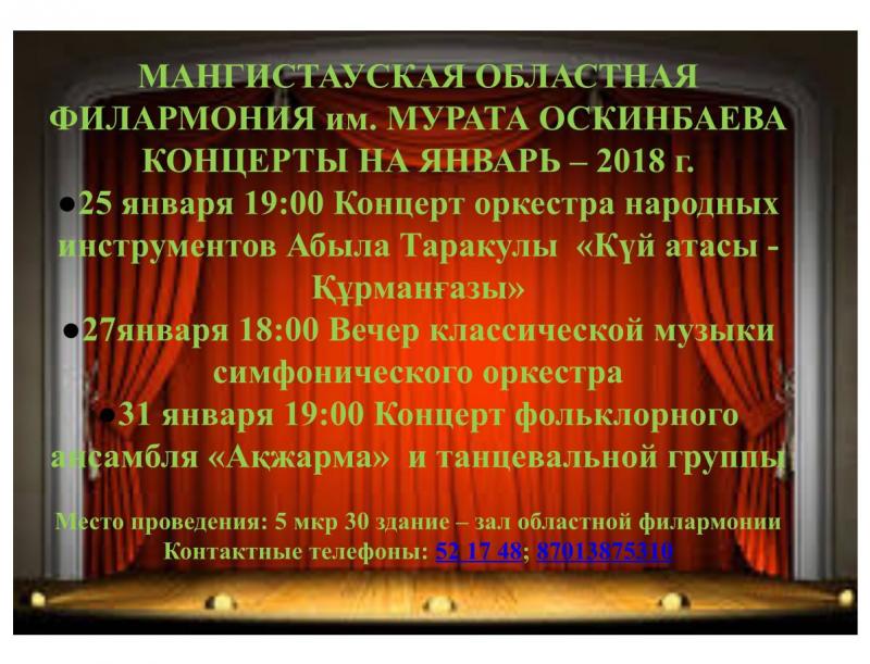 Мангистауская областная филармония имени Мурата Оскинбаева приглашает актаусцев на концерт оркестра народных инструментов Абыла Таракулы.