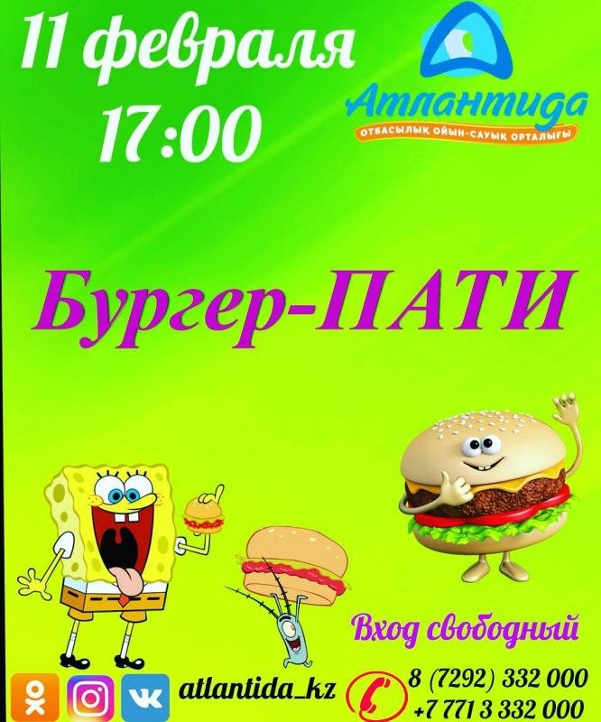 11 февраля, в 17:00 часов, в семейно-развлекательном центре "Атлантида" пройдет развлекательная программа "Бургер-ПАТИ". Кулинарные эстафеты, приготовление веселых бургеров. Приходите на веселое пати!