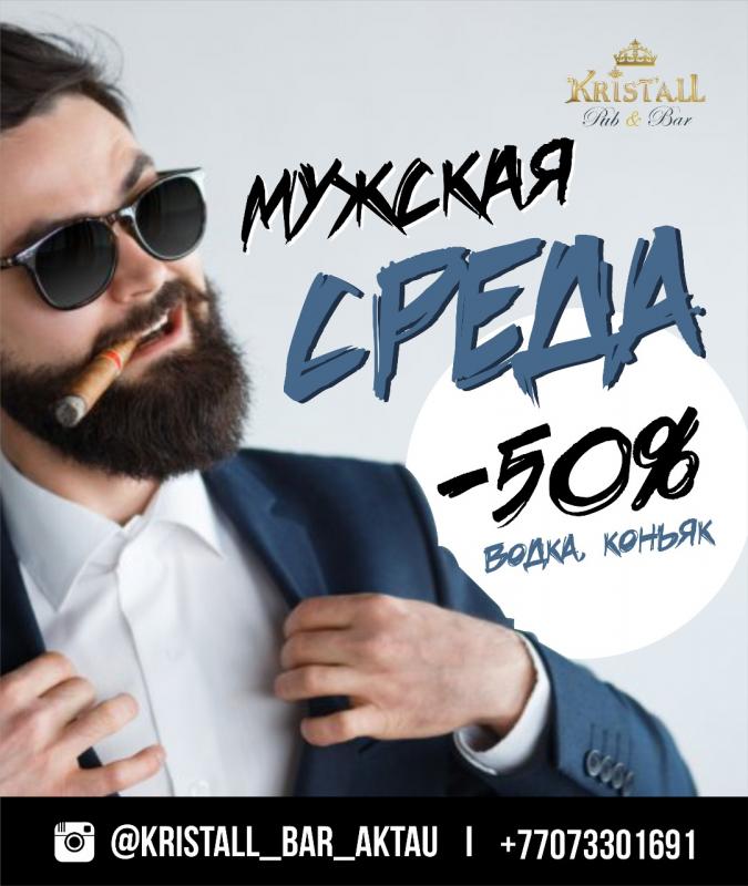 Самых сильных и мужественных Актау Kristall Pub&Bar приглашает на Мужскую среду! Специально для вас приятная скидка 50% на водку и коньяк!