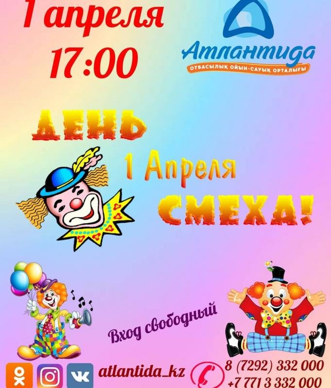 31 марта (суббота) СРЦ "Атлантида" приглашает всех детей посетить развлекательную программу "День смеха".