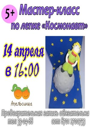 "Апельсинка" приглашает детей на мастер-класс по лепке "Космонавт", который пройдет 14 апреля, в 16:00 часов.