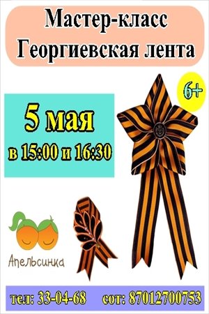 Детский развивающий центр "Апельсинка" приглашает детей мастер-класс "Георгиевская лента", посвященный Дню Победы.