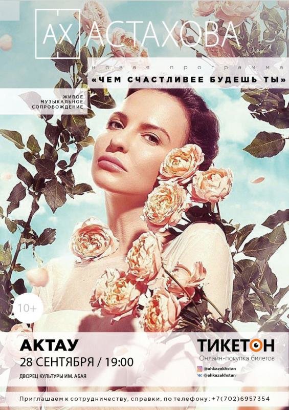 Невероятная, чувственная и такая многогранная Ах Астахова выступит во Дворце Культуры им. Абая с новой программой «Чем счастливее будешь ты». Её стихи останавливают время, зажигают душу и возбуждают разум.