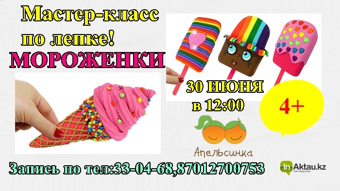 "Апельсинка" приглашает детей на увлекательный мастер-класс по лепке "Мороженки" в 12:00 часов.