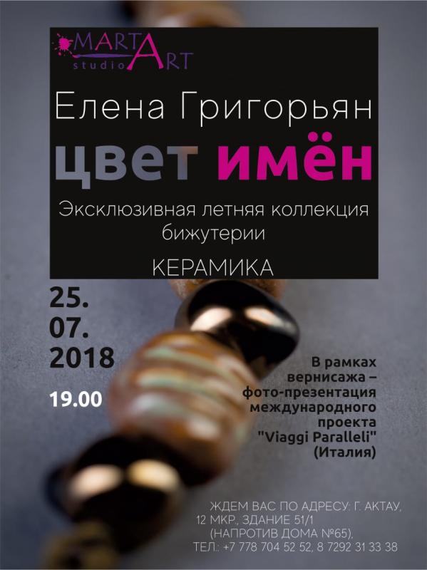 Елена Григорьян и галерея "МартАрт" представляют новую летнюю коллекцию авторских аксессуаров из керамики "Цвет Имен". Название, как всегда у Елены, таит в себе интригу. Каждый цвет ассоциируется с героиней литературного произведения. Три цвета – три героини, три имени.