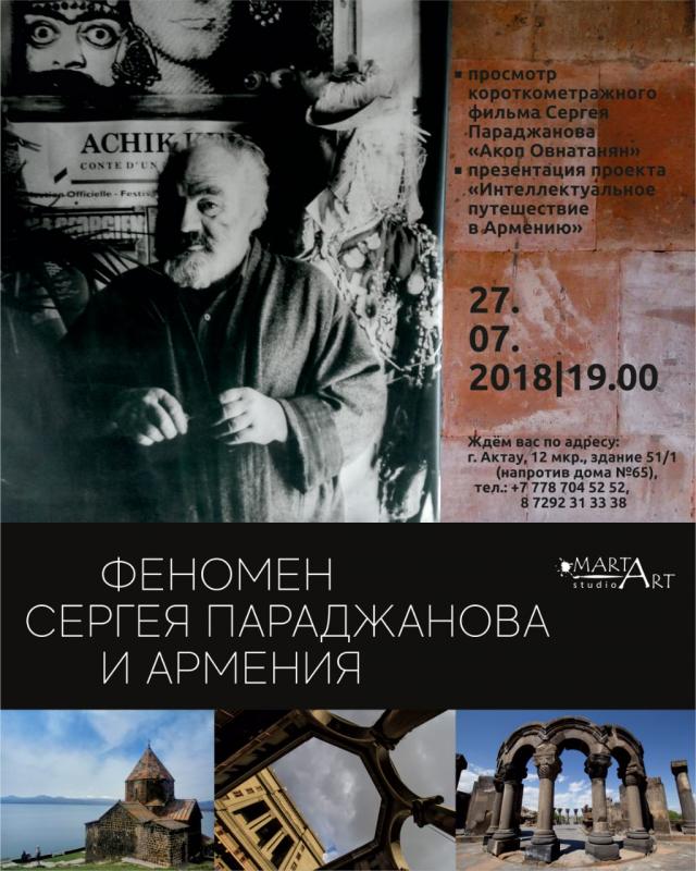 В рамках встречи буде показан необыкновенно красивый короткометражный фильм- коллаж Сергея Параджанова об известном Тифлисском художнике Акопе Овнатанян т , фотографии известного грузинского фотографа, друга Сергея Параджанова Юрия Мечитова, фотографии музея Параджанова в Ереване, а так же фото презентация проекта " Интеллектуального путешествия в Армению".