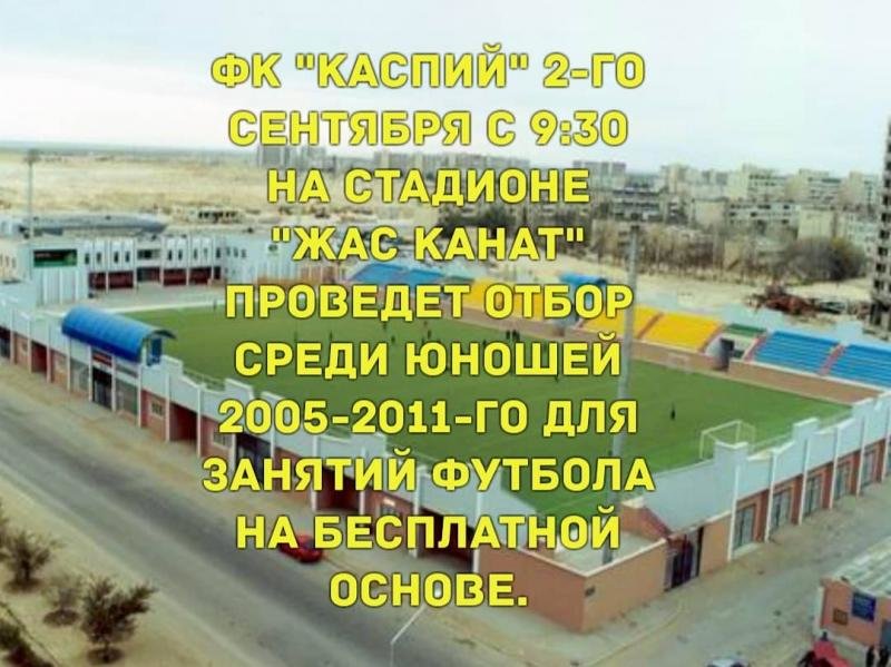 ФК "Каспий" 2 сентября с 09:30 на стадионе "Жас Канат" проведет отбор среди юношей 2005-2011-го годов рождения для занятий футболом на бесплатной основе.
