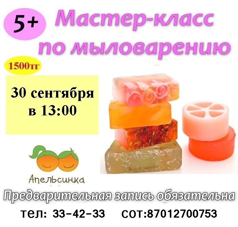 "Апельсинка" приглашает на мастер-класс по мыловарению 30 сентября в 13:00 часов.