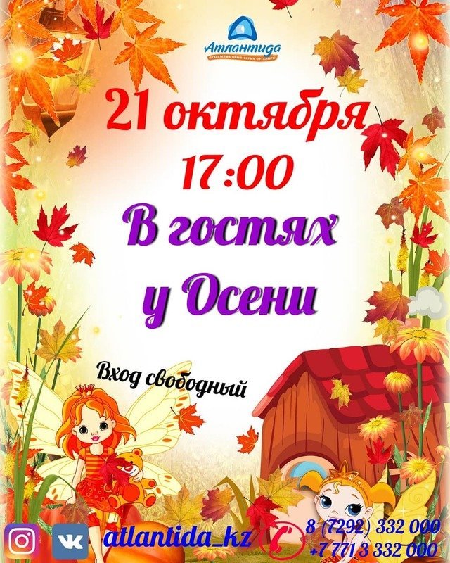 21 октября, в 17 часов, семейный центр "Атлантида" приглашает вас посетить развлекательную программу для детей "В гостях у осени". Прекрасная Осень со своими подругами подарит настоящий праздник для детям. Вас ждут весёлые танцы и интереснейшие конкурсы.