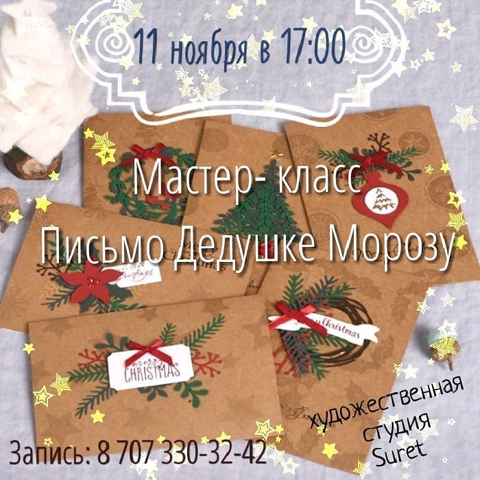 Новый год не за горами! Пора готовить письмо самому доброму,волшебному и сказочному Дедушке Морозу! Художественная студия "Сурет" приглашает всех желающих написать или нарисовать красивое письмо и сотворить волшебный конвертик своими руками. Будем творить