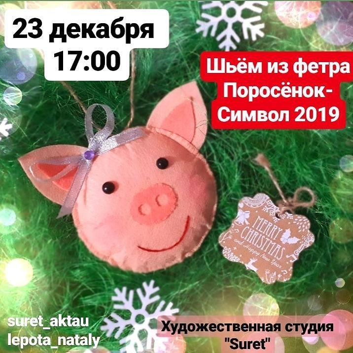 23 декабря, в 17:00 часов, художественная студия "Сурет" приглашает на мастер-класс шитья из фетра ёлочной игрушки "Поросёнок- символ 2019".