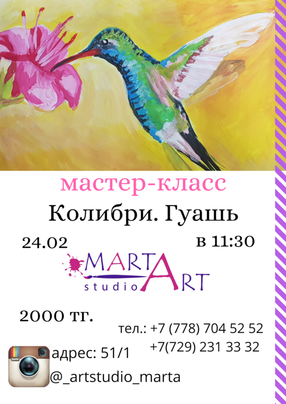 24 февраля в студии "МартАрт" пройдет мастер-класс в технике "гуашь". Наш преподаватель Камилла Багирова приготовила для Вас чудо-птицу – колибри. Начнем мы с композиции рисунка, наметив ее карандашом, затем его прорисуем. Далее самое интересное – это работа в цвете. Техника гуаши знакома многим, но не каждый пробовал это на себе. Это дается намного легче, когда рисуешь,что-то красивое и интересное. Если Вы желаете познакомиться с этой прекрасной техникой, Вас ждут в уютной, творческой студии "МартАрт".