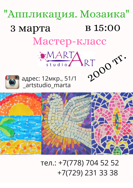 В студии "МартАрт" намечается очередной мастер-класс в технике мозаика - аппликация из цветной бумаги, давно уже ставшее традиционнымтворческим занятием для детей. Оно позволяет развить навыки обращения с ножницами, усовершенствовать работу детских ручек и сделать ребенка более аккуратным. Если поставить перед ним выполнимую задачу, каждый ребенок сможет сделать красивую вещь своими руками. Весь необходимый материал предоставляется студией.
