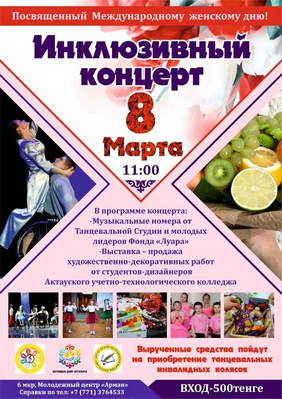 В программе инклюзивного концерта, приуроченного к Международному женскому дню, ожидаются музыкальные номера от танцевальной студии и молодых лидеров фонда "Луара", выставка-продажа художественно-декоративных работ от студентов-дизайнеров Актауского учетно-технологического колледжа.