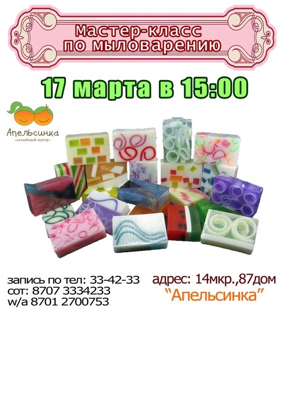 Детский развивающий центр "Апельсинка" приглашает ребят на мастер-класс по мыловарению.