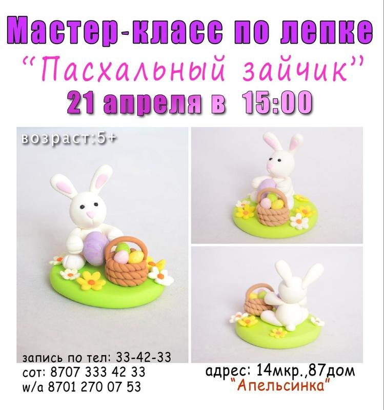 Детский развивающий центр "Апельсинка" приглашает детей на мастер-класс по лепке "Пасхальный зайчик".