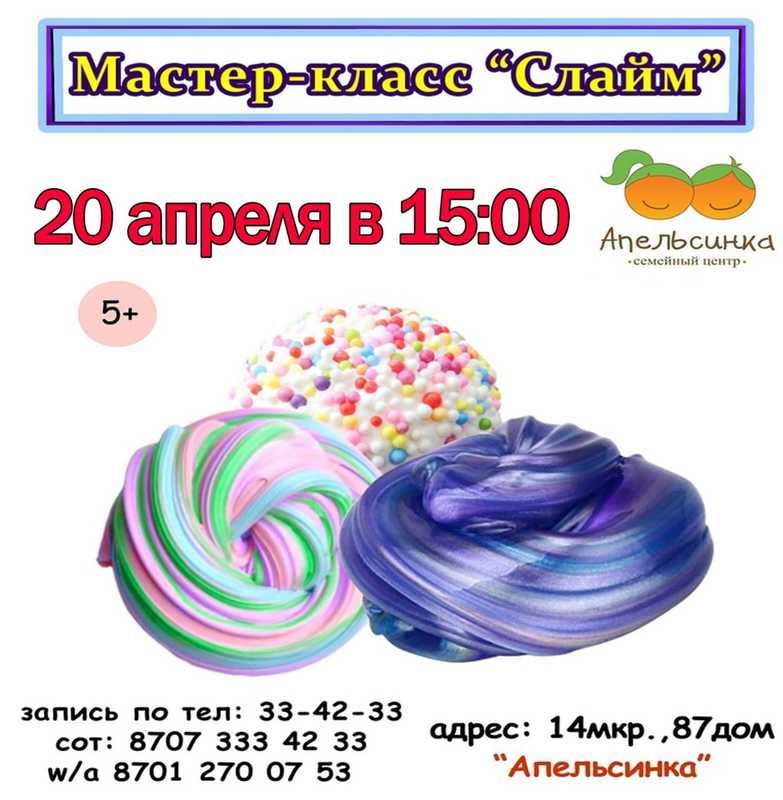 Детский развивающий центр "Апельсинка" приглшает детей на мастер-класс по изготовлению слайма.