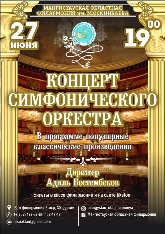 27 июня в 19:00 симфонический оркестр Мангистауской обл. филармонии им. М. Оскинбаева приглашает вас на концерт посвященный закрытию ХII концертного сезона.