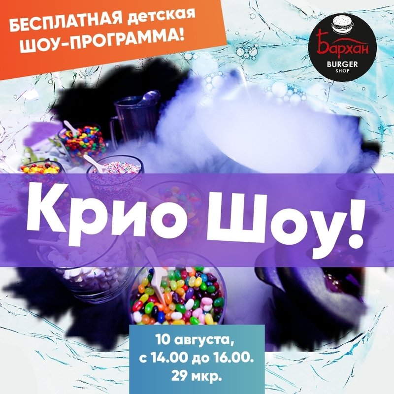 В эту субботу, 10 августа, мы устраиваем для ваших деток бесплатную детскую шоу-программу и КРИО-шоу!