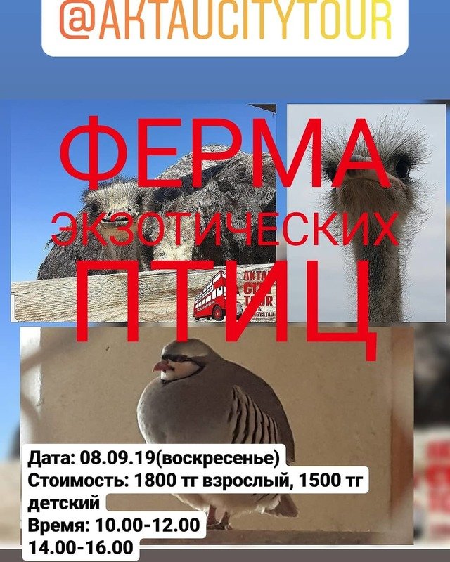 Aktau City Tour приглашает на ферму экзотических птиц.