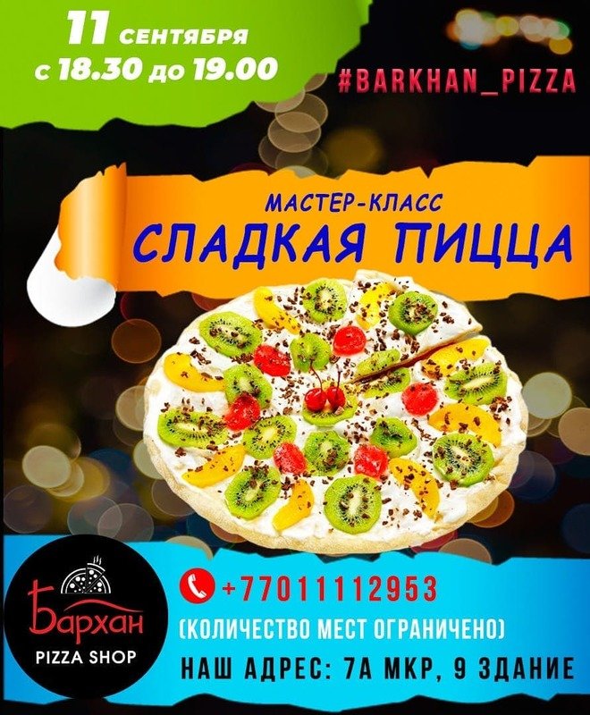 BARKHAN PIZZA SHOP приглашает детей на мастер-класс "Сладкая пицца", который пройдет 11 сентября с 18:30 до 19:00.