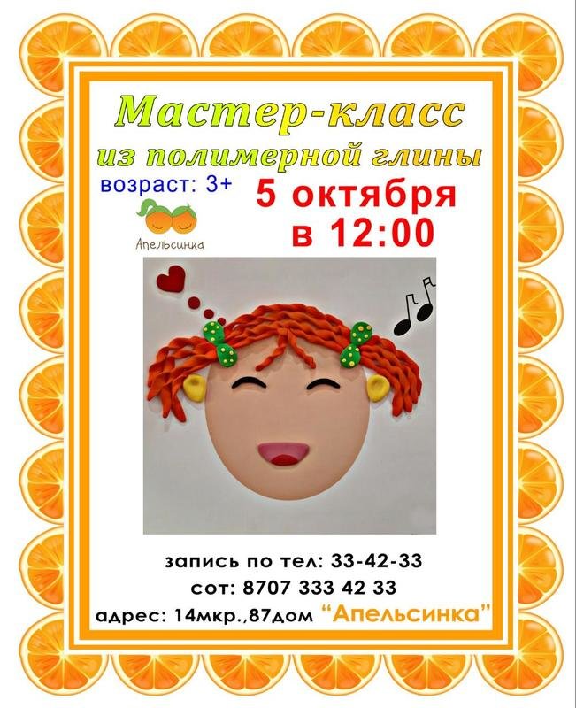 Детский развивающий центр "Апельсинка" приглашает детей на мастер-класс по работе с полимерной глиной.
