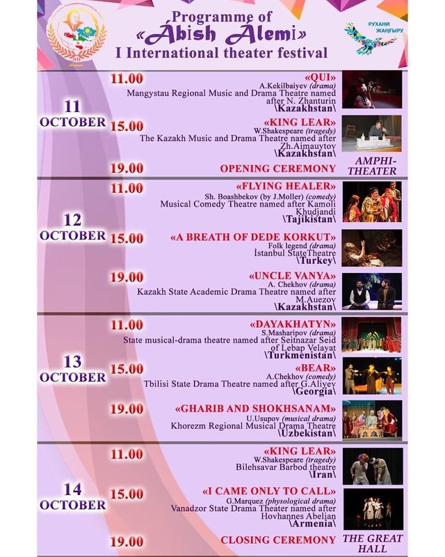 Культурное мероприятие пройдет на сцене амфитеатра на набережной 15 микрорайона, начиная с 11 октября. Свои спектакли представят артисты из Казахстана, Таджикистана, Турции, Туркменистана, Грузии, Исламской Республики Иран и Армении.