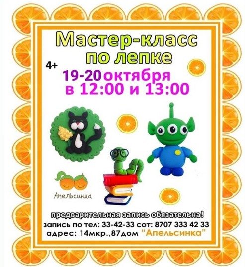 Семейный центр Апельсинка приглашает на мастер-классы по лепке из полимерной глины на свободную тему, которые пройдут 19 и 20 октября в 12:00 и 13:00.