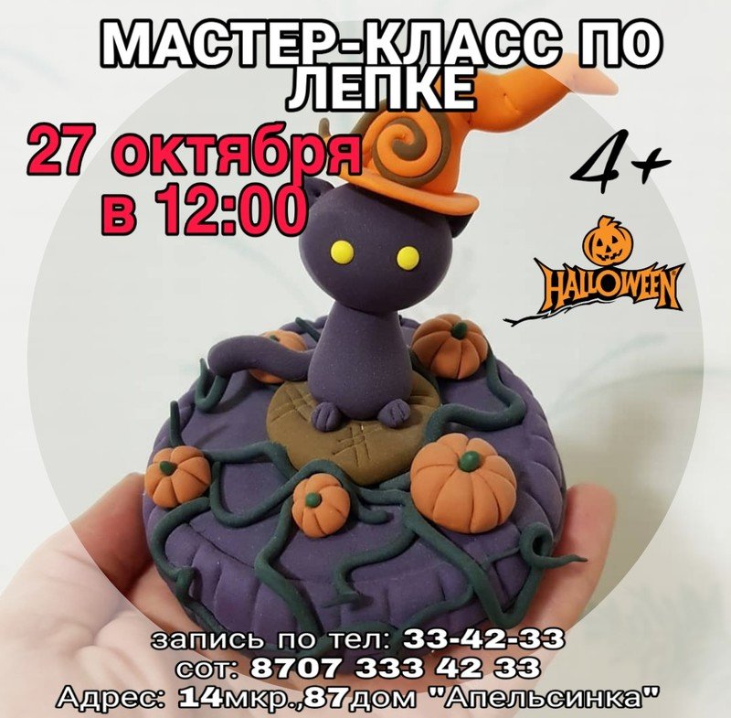 Детский развивающий центр "Апельсинка" приглашает детей на мастер-класс по лепке тематического котика к празднику Хэллоуин.