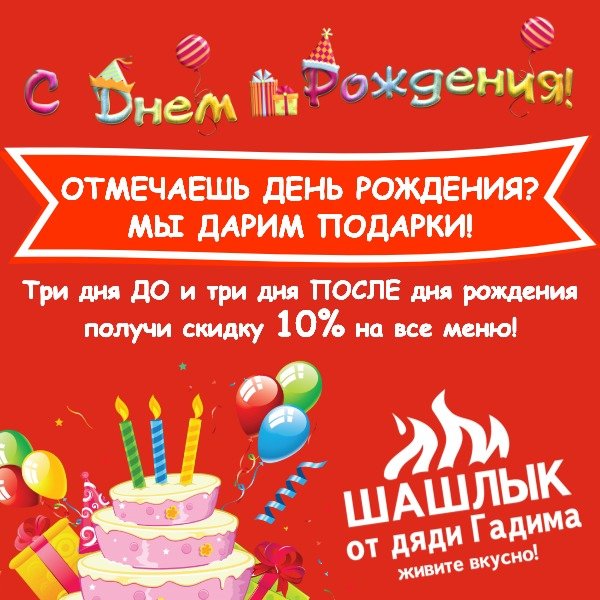 Отмечайте праздник с нами - именинникам 10% скидка! Вкуснейшее мясо и большой ассортимент разливного пива - что еще нужно для отдыха?!