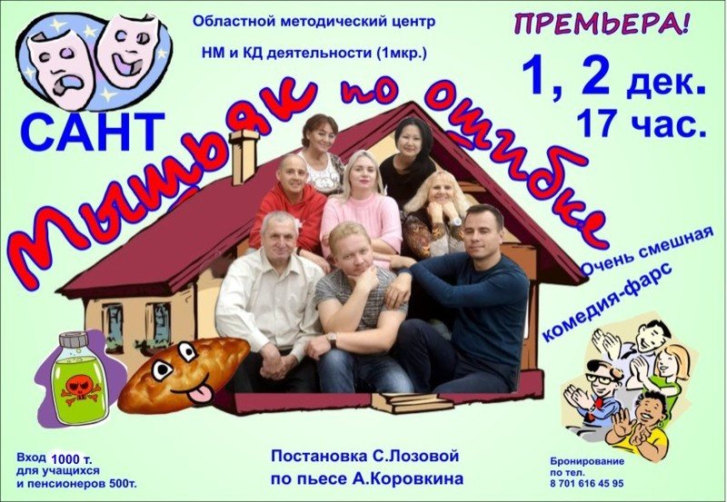 Спектакль "Мышьяк по ошибке", поставлен режиссером театра С.Лозовой по пьесе А.Коровкина. Пьеса российского драматурга очень смешная, веселая, остроумная. События пьесы детективные, мелодраматические и социальные сменяют друг друга с невероятной быстротой, заставляя героев пьесы мгновенно приспосабливаться к сиюминутной непредсказуемости жизни. В спектакле переплетется все - и юмор, и лиризм, и житейская мудрость, и неожиданная развязка…