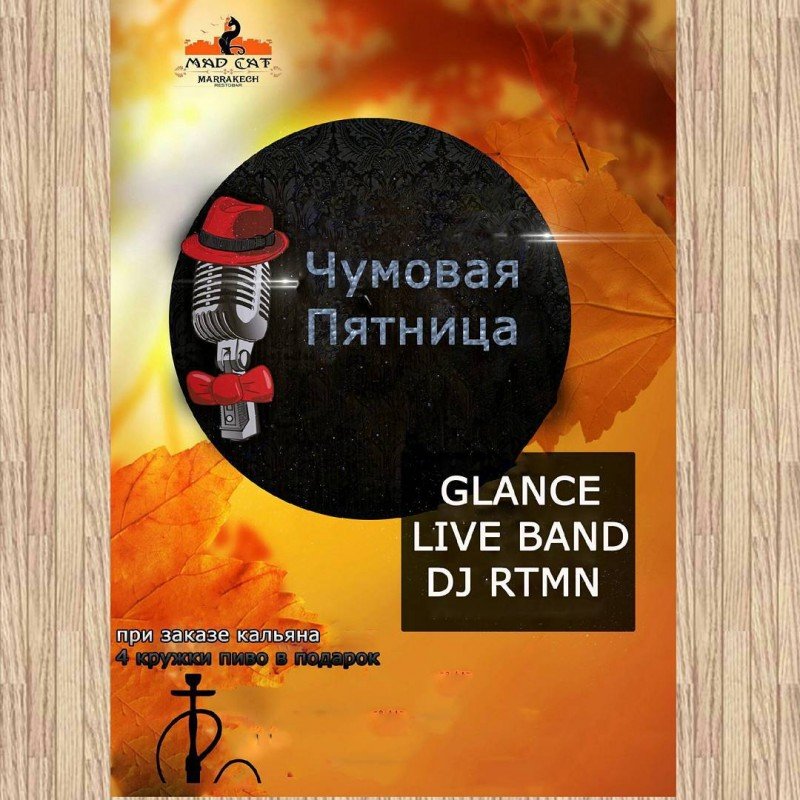С 22:00 для вас будет выступать группа GLANCE и заканчивать вечер крутыми сетами будет DJ RTMN (UA) + будет действовать акция, при заказе кальяна 4 кружки пиво в подарок.