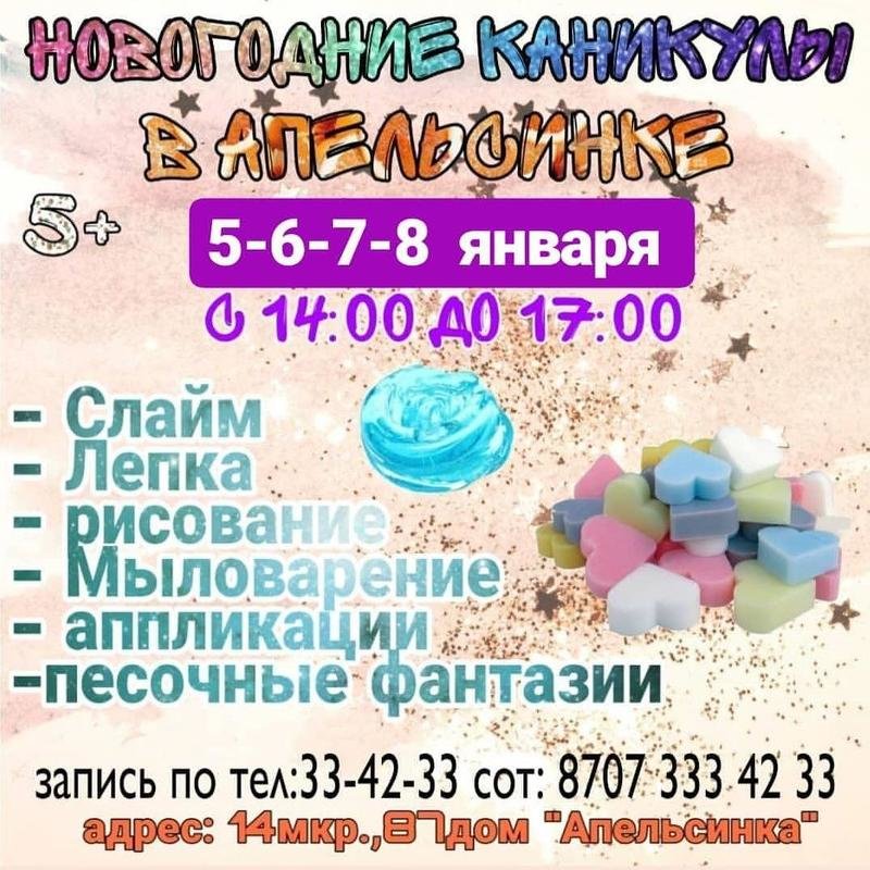 Детский развивающий центр "Апельсинка" приглашает ребят на серию творческих мастер-классов по изготовлению слайма, аппликации, лепке, мыловарению и "Песочные фантазии".