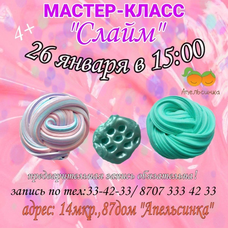 Детский развивающий центр "Апельсинка" приглашает детей на мастер-класс по изготовлению слайма своими руками.