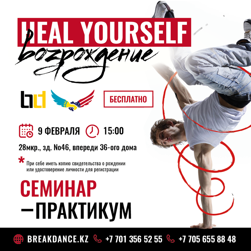 9 февраля в рамках проекта Heal Yourself для детей и молодежи пройдет бесплатный танцевальный мастер-класс для тех, кто хочет заниматься или усовершенствовать свои навыки в брейкинге.
