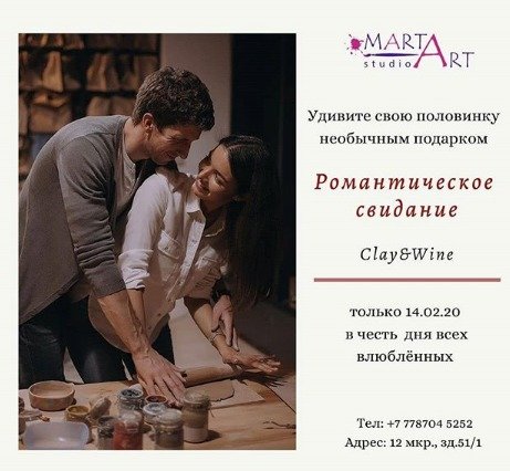 Тогда приходите и проведите романтическое свидание в нашей студии! Уютная атмосфера, романтичная музыка и вино, настроят на нужный лад. Вас ждёт 1.5-часовой мастер-класс по керамической лепке!
